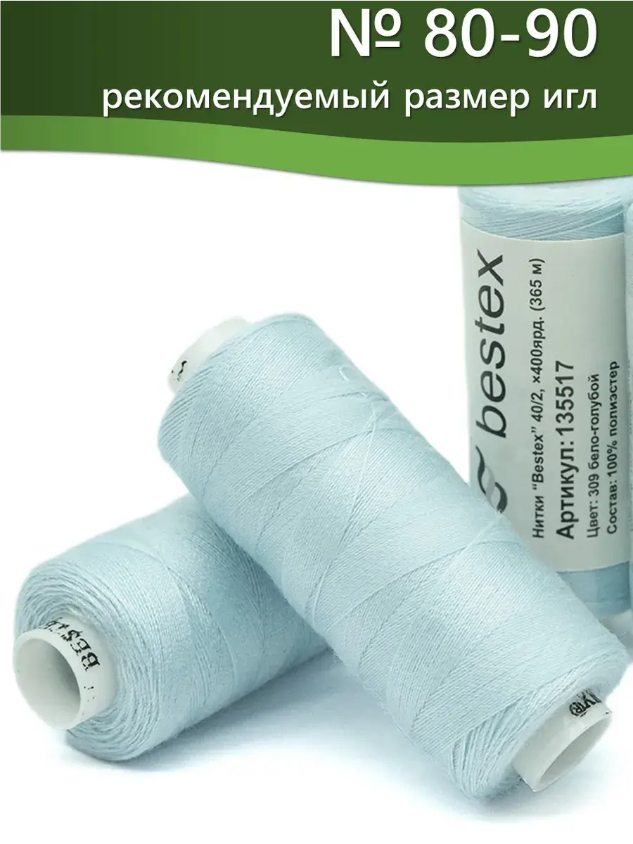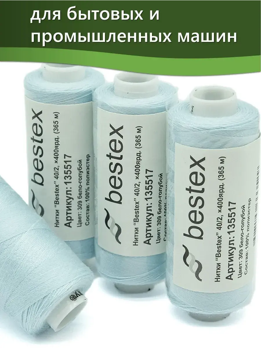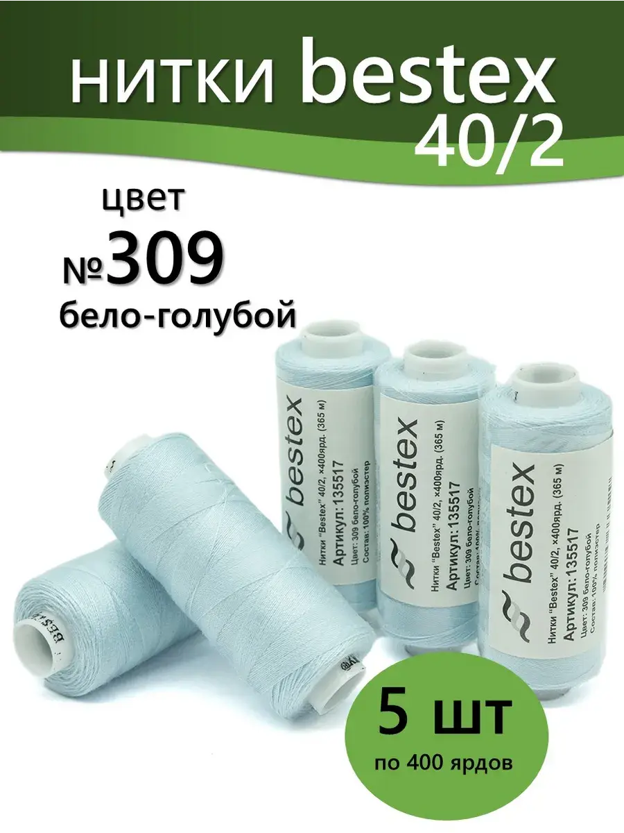 Набор ниток Bestex №40/2 – прекрасный вариант для шитья, ремонта текстильных изделий, рукоделия. Подойдут для бытовых и промышленных швейных машин. Изготовлены из 100 % полиэстера, прочные на разрыв и слегка эластичные, равномерные по толщине, имеют правостороннюю крутку. Обработаны силиконом на 3%, поэтому меньше разрываются при работе на высоких скоростях. Не истончаются и не теряют цвет после многократных стирок и от воздействия ультрафиолетовых лучей. Усадка минимальна, ворс и узелки почти не выражены. Нитки №40/2 подходят для работы с легкими тканями и тканями среднего веса. Назначение: – ремонт текстильных изделий, штопка вещей из трикотажа; – обработка срезов; – шитье вручную и на швейной машине. Линейная плотность: 14,8 x 2 текс. Разрывная нагрузка: 1050 сН. Рекомендуемый размер иглы: №80-90. В упаковке 5 бобин в намотке 400 ярдов.