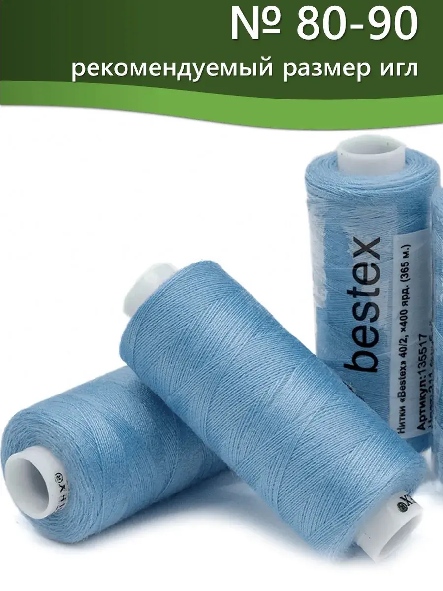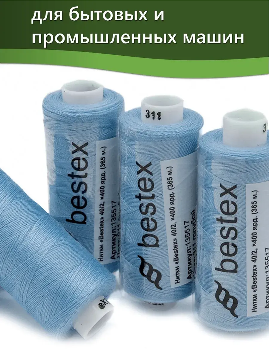 Набор ниток Bestex №40/2 – прекрасный вариант для шитья, ремонта текстильных изделий, рукоделия. Подойдут для бытовых и промышленных швейных машин. Изготовлены из 100 % полиэстера, прочные на разрыв и слегка эластичные, равномерные по толщине, имеют правостороннюю крутку. Обработаны силиконом на 3%, поэтому меньше разрываются при работе на высоких скоростях. Не истончаются и не теряют цвет после многократных стирок и от воздействия ультрафиолетовых лучей. Усадка минимальна, ворс и узелки почти не выражены. Нитки №40/2 подходят для работы с легкими тканями и тканями среднего веса. Назначение: – ремонт текстильных изделий, штопка вещей из трикотажа; – обработка срезов; – шитье вручную и на швейной машине. Линейная плотность: 14,8 x 2 текс. Разрывная нагрузка: 1050 сН. Рекомендуемый размер иглы: №80-90. В упаковке 5 бобин в намотке 400 ярдов.