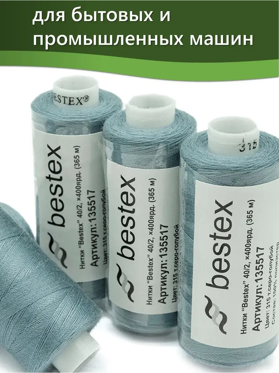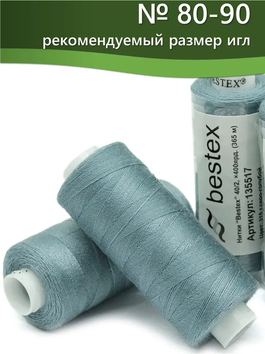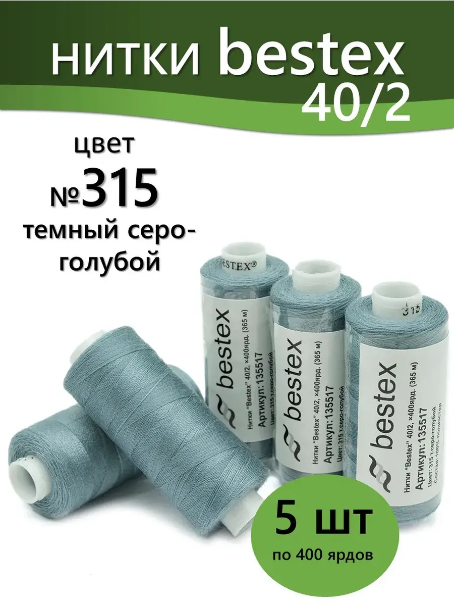 Набор ниток Bestex №40/2 – прекрасный вариант для шитья, ремонта текстильных изделий, рукоделия. Подойдут для бытовых и промышленных швейных машин. Изготовлены из 100 % полиэстера, прочные на разрыв и слегка эластичные, равномерные по толщине, имеют правостороннюю крутку. Обработаны силиконом на 3%, поэтому меньше разрываются при работе на высоких скоростях. Не истончаются и не теряют цвет после многократных стирок и от воздействия ультрафиолетовых лучей. Усадка минимальна, ворс и узелки почти не выражены. Нитки №40/2 подходят для работы с легкими тканями и тканями среднего веса. Назначение: – ремонт текстильных изделий, штопка вещей из трикотажа; – обработка срезов; – шитье вручную и на швейной машине. Линейная плотность: 14,8 x 2 текс. Разрывная нагрузка: 1050 сН. Рекомендуемый размер иглы: №80-90. В упаковке 5 бобин в намотке 400 ярдов.