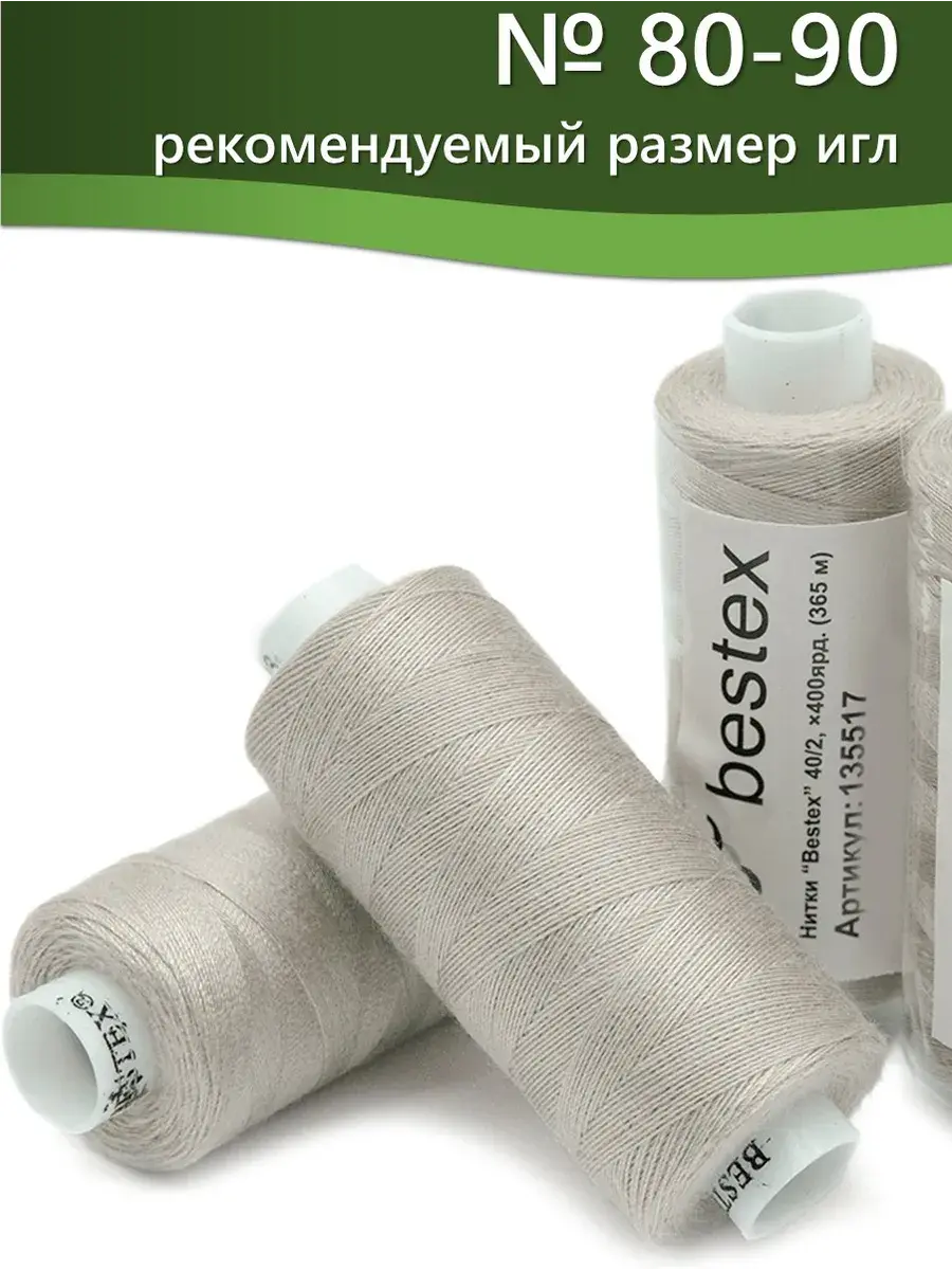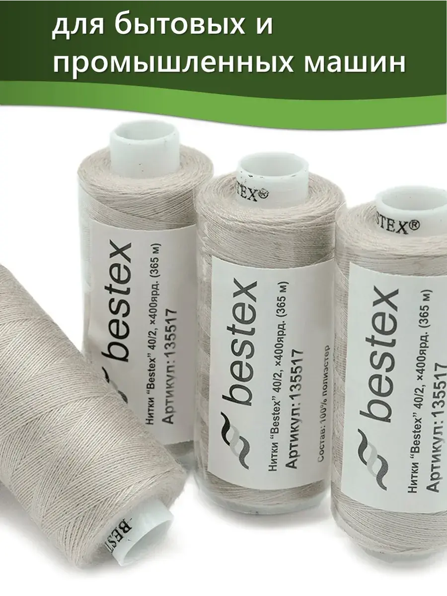 Набор ниток Bestex №40/2 – прекрасный вариант для шитья, ремонта текстильных изделий, рукоделия. Подойдут для бытовых и промышленных швейных машин. Изготовлены из 100 % полиэстера, прочные на разрыв и слегка эластичные, равномерные по толщине, имеют правостороннюю крутку. Обработаны силиконом на 3%, поэтому меньше разрываются при работе на высоких скоростях. Не истончаются и не теряют цвет после многократных стирок и от воздействия ультрафиолетовых лучей. Усадка минимальна, ворс и узелки почти не выражены. Нитки №40/2 подходят для работы с легкими тканями и тканями среднего веса. Назначение: – ремонт текстильных изделий, штопка вещей из трикотажа; – обработка срезов; – шитье вручную и на швейной машине. Линейная плотность: 14,8 x 2 текс. Разрывная нагрузка: 1050 сН. Рекомендуемый размер иглы: №80-90. В упаковке 5 бобин в намотке 400 ярдов.