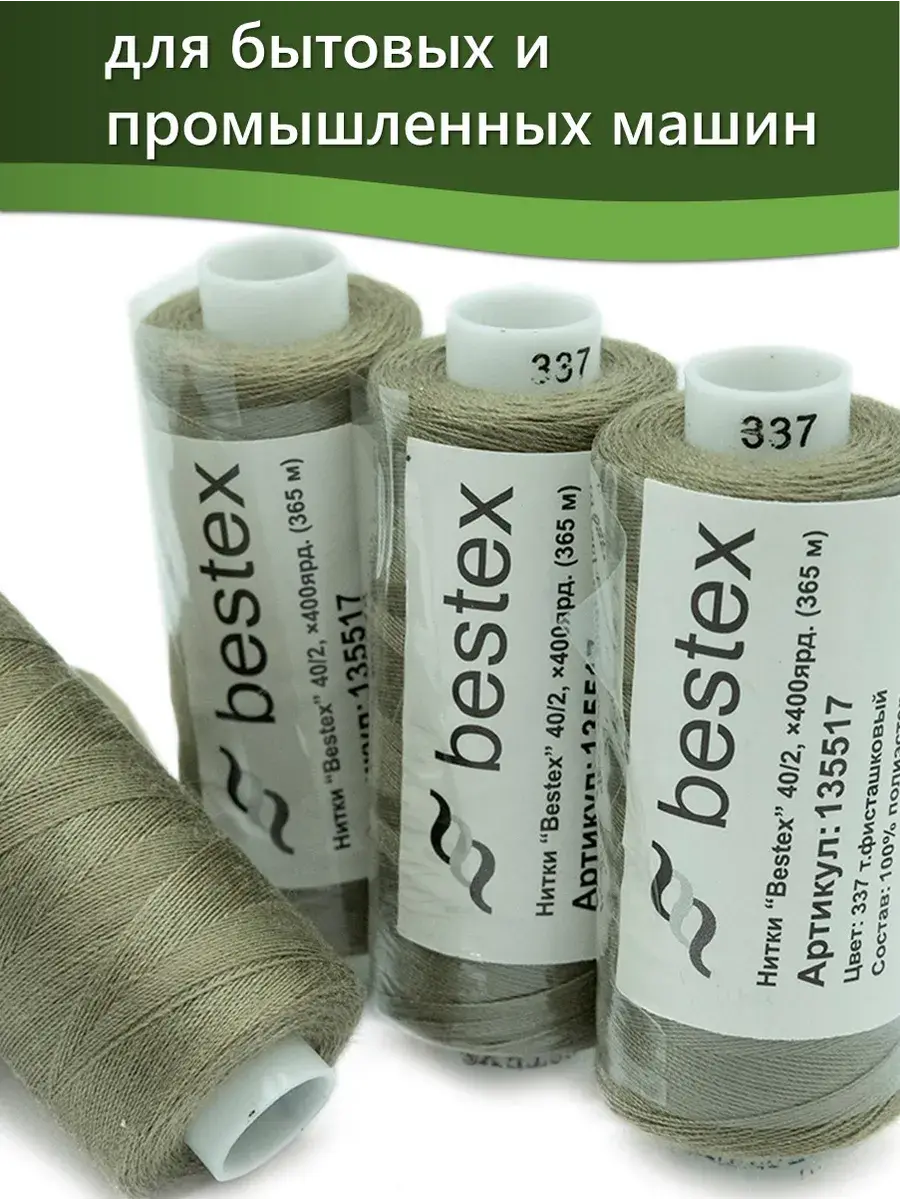 Набор ниток Bestex №40/2 – прекрасный вариант для шитья, ремонта текстильных изделий, рукоделия. Подойдут для бытовых и промышленных швейных машин. Изготовлены из 100 % полиэстера, прочные на разрыв и слегка эластичные, равномерные по толщине, имеют правостороннюю крутку. Обработаны силиконом на 3%, поэтому меньше разрываются при работе на высоких скоростях. Не истончаются и не теряют цвет после многократных стирок и от воздействия ультрафиолетовых лучей. Усадка минимальна, ворс и узелки почти не выражены. Нитки №40/2 подходят для работы с легкими тканями и тканями среднего веса. Назначение: – ремонт текстильных изделий, штопка вещей из трикотажа; – обработка срезов; – шитье вручную и на швейной машине. Линейная плотность: 14,8 x 2 текс. Разрывная нагрузка: 1050 сН. Рекомендуемый размер иглы: №80-90. В упаковке 5 бобин в намотке 400 ярдов.
