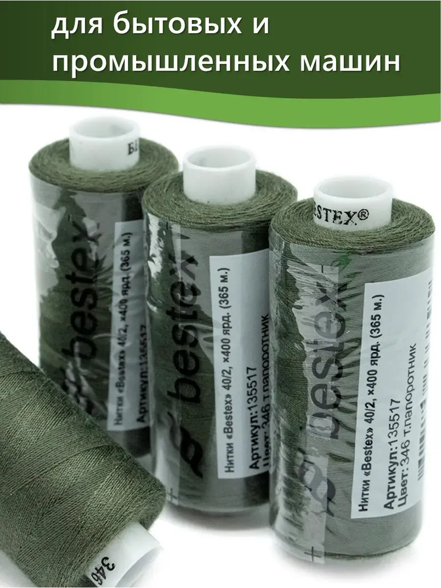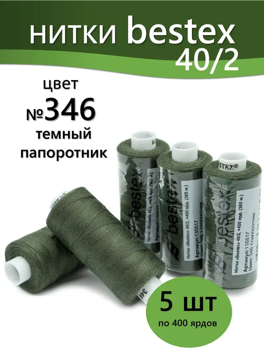 Набор ниток Bestex №40/2 – прекрасный вариант для шитья, ремонта текстильных изделий, рукоделия. Подойдут для бытовых и промышленных швейных машин. Изготовлены из 100 % полиэстера, прочные на разрыв и слегка эластичные, равномерные по толщине, имеют правостороннюю крутку. Обработаны силиконом на 3%, поэтому меньше разрываются при работе на высоких скоростях. Не истончаются и не теряют цвет после многократных стирок и от воздействия ультрафиолетовых лучей. Усадка минимальна, ворс и узелки почти не выражены. Нитки №40/2 подходят для работы с легкими тканями и тканями среднего веса. Назначение: – ремонт текстильных изделий, штопка вещей из трикотажа; – обработка срезов; – шитье вручную и на швейной машине. Линейная плотность: 14,8 x 2 текс. Разрывная нагрузка: 1050 сН. Рекомендуемый размер иглы: №80-90. В упаковке 5 бобин в намотке 400 ярдов.