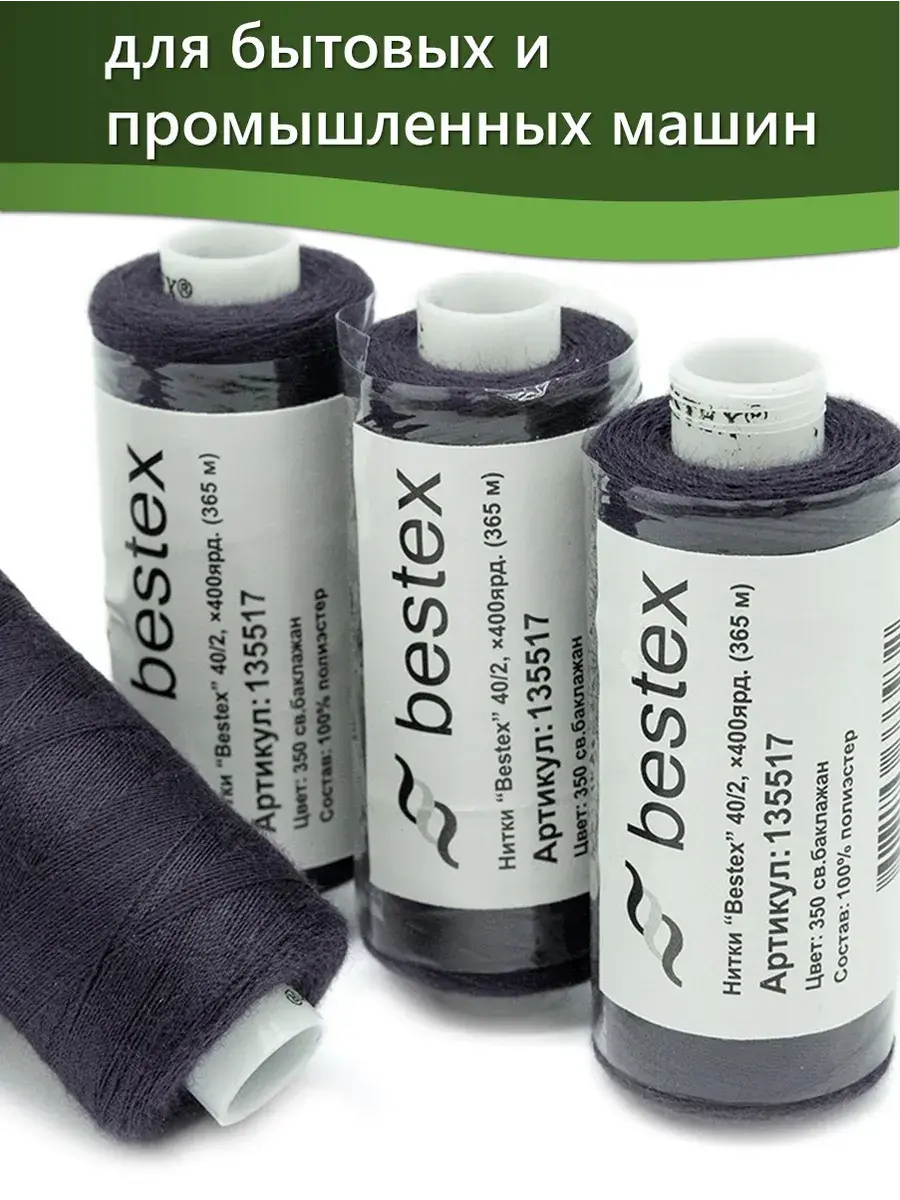 Набор ниток Bestex №40/2 – прекрасный вариант для шитья, ремонта текстильных изделий, рукоделия. Подойдут для бытовых и промышленных швейных машин. Изготовлены из 100 % полиэстера, прочные на разрыв и слегка эластичные, равномерные по толщине, имеют правостороннюю крутку. Обработаны силиконом на 3%, поэтому меньше разрываются при работе на высоких скоростях. Не истончаются и не теряют цвет после многократных стирок и от воздействия ультрафиолетовых лучей. Усадка минимальна, ворс и узелки почти не выражены. Нитки №40/2 подходят для работы с легкими тканями и тканями среднего веса. Назначение: – ремонт текстильных изделий, штопка вещей из трикотажа; – обработка срезов; – шитье вручную и на швейной машине. Линейная плотность: 14,8 x 2 текс. Разрывная нагрузка: 1050 сН. Рекомендуемый размер иглы: №80-90. В упаковке 5 бобин в намотке 400 ярдов.
