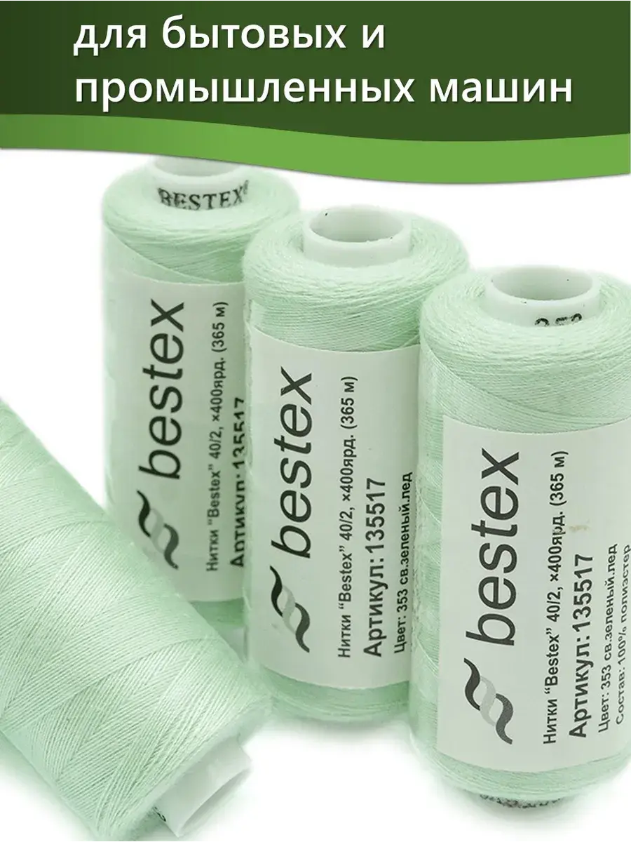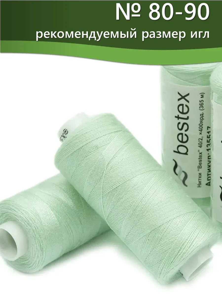 Набор ниток Bestex №40/2 – прекрасный вариант для шитья, ремонта текстильных изделий, рукоделия. Подойдут для бытовых и промышленных швейных машин. Изготовлены из 100 % полиэстера, прочные на разрыв и слегка эластичные, равномерные по толщине, имеют правостороннюю крутку. Обработаны силиконом на 3%, поэтому меньше разрываются при работе на высоких скоростях. Не истончаются и не теряют цвет после многократных стирок и от воздействия ультрафиолетовых лучей. Усадка минимальна, ворс и узелки почти не выражены. Нитки №40/2 подходят для работы с легкими тканями и тканями среднего веса. Назначение: – ремонт текстильных изделий, штопка вещей из трикотажа; – обработка срезов; – шитье вручную и на швейной машине. Линейная плотность: 14,8 x 2 текс. Разрывная нагрузка: 1050 сН. Рекомендуемый размер иглы: №80-90. В упаковке 5 бобин в намотке 400 ярдов.