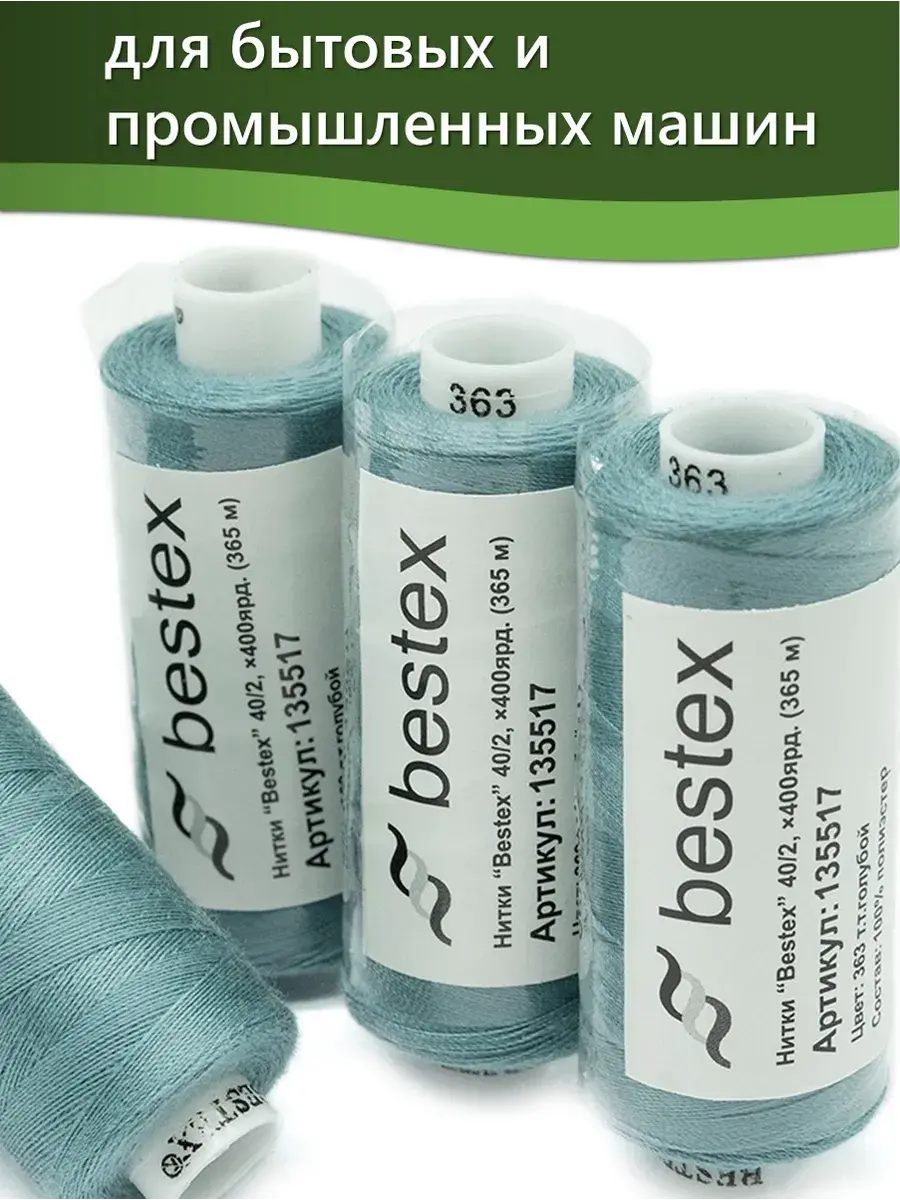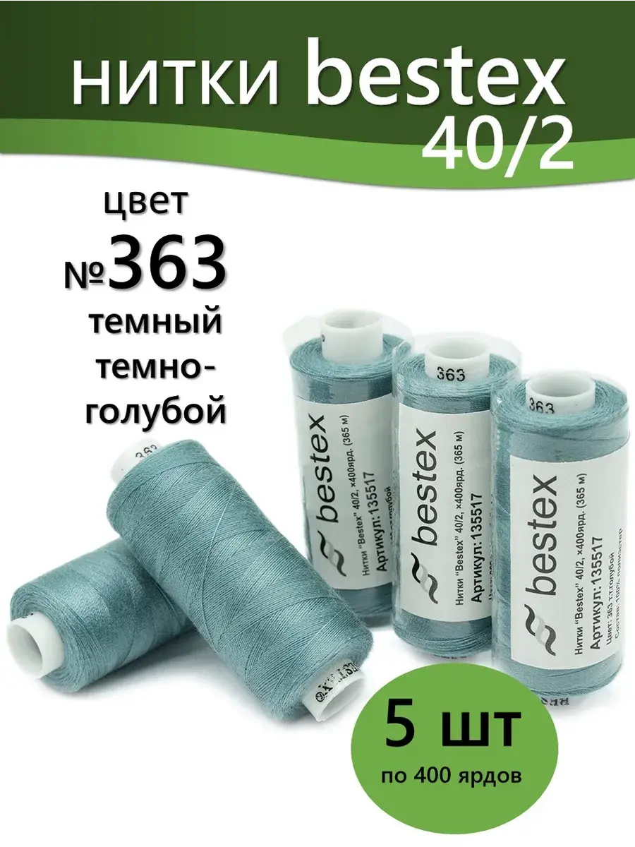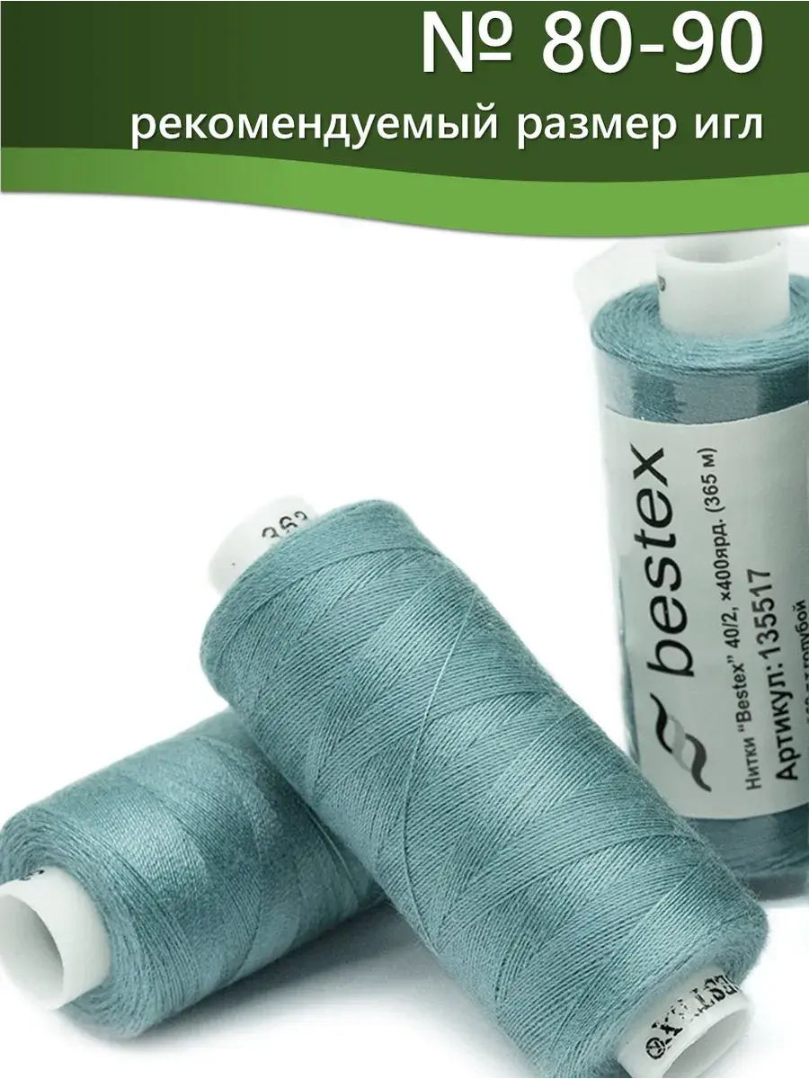 Набор ниток Bestex №40/2 – прекрасный вариант для шитья, ремонта текстильных изделий, рукоделия. Подойдут для бытовых и промышленных швейных машин. Изготовлены из 100 % полиэстера, прочные на разрыв и слегка эластичные, равномерные по толщине, имеют правостороннюю крутку. Обработаны силиконом на 3%, поэтому меньше разрываются при работе на высоких скоростях. Не истончаются и не теряют цвет после многократных стирок и от воздействия ультрафиолетовых лучей. Усадка минимальна, ворс и узелки почти не выражены. Нитки №40/2 подходят для работы с легкими тканями и тканями среднего веса. Назначение: – ремонт текстильных изделий, штопка вещей из трикотажа; – обработка срезов; – шитье вручную и на швейной машине. Линейная плотность: 14,8 x 2 текс. Разрывная нагрузка: 1050 сН. Рекомендуемый размер иглы: №80-90. В упаковке 5 бобин в намотке 400 ярдов.