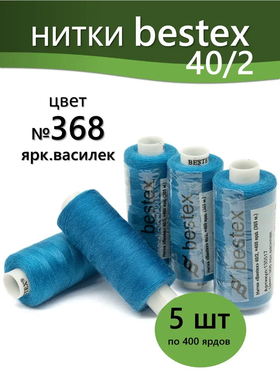 Набор ниток Bestex №40/2 – прекрасный вариант для шитья, ремонта текстильных изделий, рукоделия. Подойдут для бытовых и промышленных швейных машин. Изготовлены из 100 % полиэстера, прочные на разрыв и слегка эластичные, равномерные по толщине, имеют правостороннюю крутку. Обработаны силиконом на 3%, поэтому меньше разрываются при работе на высоких скоростях. Не истончаются и не теряют цвет после многократных стирок и от воздействия ультрафиолетовых лучей. Усадка минимальна, ворс и узелки почти не выражены. Нитки №40/2 подходят для работы с легкими тканями и тканями среднего веса. Назначение: – ремонт текстильных изделий, штопка вещей из трикотажа; – обработка срезов; – шитье вручную и на швейной машине. Линейная плотность: 14,8 x 2 текс. Разрывная нагрузка: 1050 сН. Рекомендуемый размер иглы: №80-90. В упаковке 5 бобин в намотке 400 ярдов.