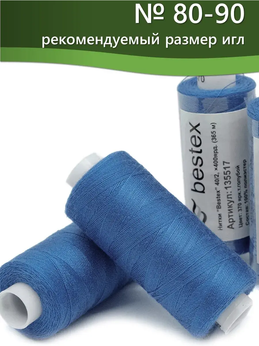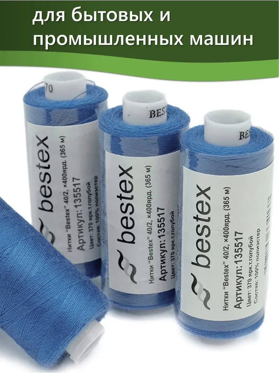 Набор ниток Bestex №40/2 – прекрасный вариант для шитья, ремонта текстильных изделий, рукоделия. Подойдут для бытовых и промышленных швейных машин. Изготовлены из 100 % полиэстера, прочные на разрыв и слегка эластичные, равномерные по толщине, имеют правостороннюю крутку. Обработаны силиконом на 3%, поэтому меньше разрываются при работе на высоких скоростях. Не истончаются и не теряют цвет после многократных стирок и от воздействия ультрафиолетовых лучей. Усадка минимальна, ворс и узелки почти не выражены. Нитки №40/2 подходят для работы с легкими тканями и тканями среднего веса. Назначение: – ремонт текстильных изделий, штопка вещей из трикотажа; – обработка срезов; – шитье вручную и на швейной машине. Линейная плотность: 14,8 x 2 текс. Разрывная нагрузка: 1050 сН. Рекомендуемый размер иглы: №80-90. В упаковке 5 бобин в намотке 400 ярдов.