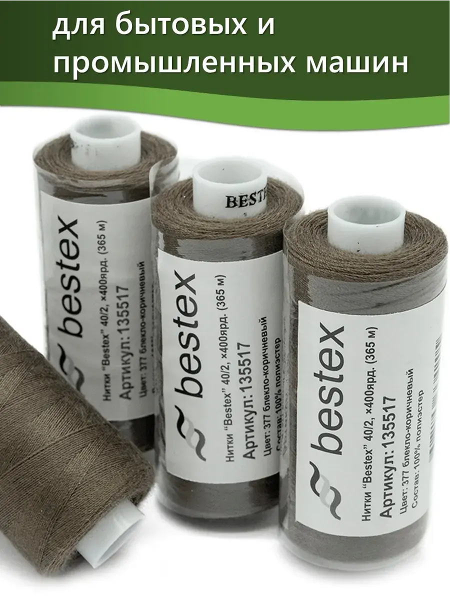 Набор ниток Bestex №40/2 – прекрасный вариант для шитья, ремонта текстильных изделий, рукоделия. Подойдут для бытовых и промышленных швейных машин. Изготовлены из 100 % полиэстера, прочные на разрыв и слегка эластичные, равномерные по толщине, имеют правостороннюю крутку. Обработаны силиконом на 3%, поэтому меньше разрываются при работе на высоких скоростях. Не истончаются и не теряют цвет после многократных стирок и от воздействия ультрафиолетовых лучей. Усадка минимальна, ворс и узелки почти не выражены. Нитки №40/2 подходят для работы с легкими тканями и тканями среднего веса. Назначение: – ремонт текстильных изделий, штопка вещей из трикотажа; – обработка срезов; – шитье вручную и на швейной машине. Линейная плотность: 14,8 x 2 текс. Разрывная нагрузка: 1050 сН. Рекомендуемый размер иглы: №80-90. В упаковке 5 бобин в намотке 400 ярдов.