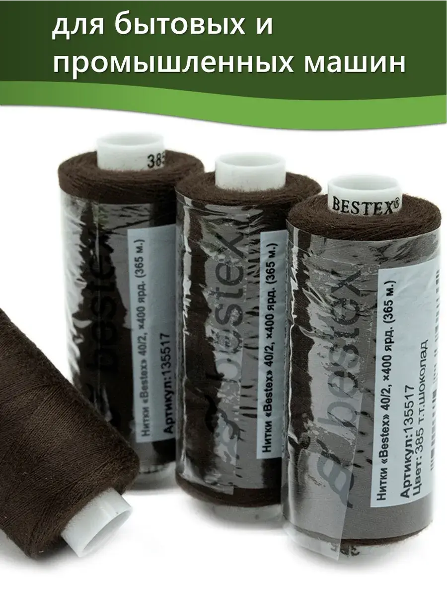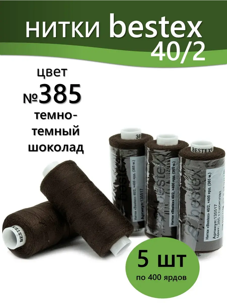 Набор ниток Bestex №40/2 – прекрасный вариант для шитья, ремонта текстильных изделий, рукоделия. Подойдут для бытовых и промышленных швейных машин. Изготовлены из 100 % полиэстера, прочные на разрыв и слегка эластичные, равномерные по толщине, имеют правостороннюю крутку. Обработаны силиконом на 3%, поэтому меньше разрываются при работе на высоких скоростях. Не истончаются и не теряют цвет после многократных стирок и от воздействия ультрафиолетовых лучей. Усадка минимальна, ворс и узелки почти не выражены. Нитки №40/2 подходят для работы с легкими тканями и тканями среднего веса. Назначение: – ремонт текстильных изделий, штопка вещей из трикотажа; – обработка срезов; – шитье вручную и на швейной машине. Линейная плотность: 14,8 x 2 текс. Разрывная нагрузка: 1050 сН. Рекомендуемый размер иглы: №80-90. В упаковке 5 бобин в намотке 400 ярдов.