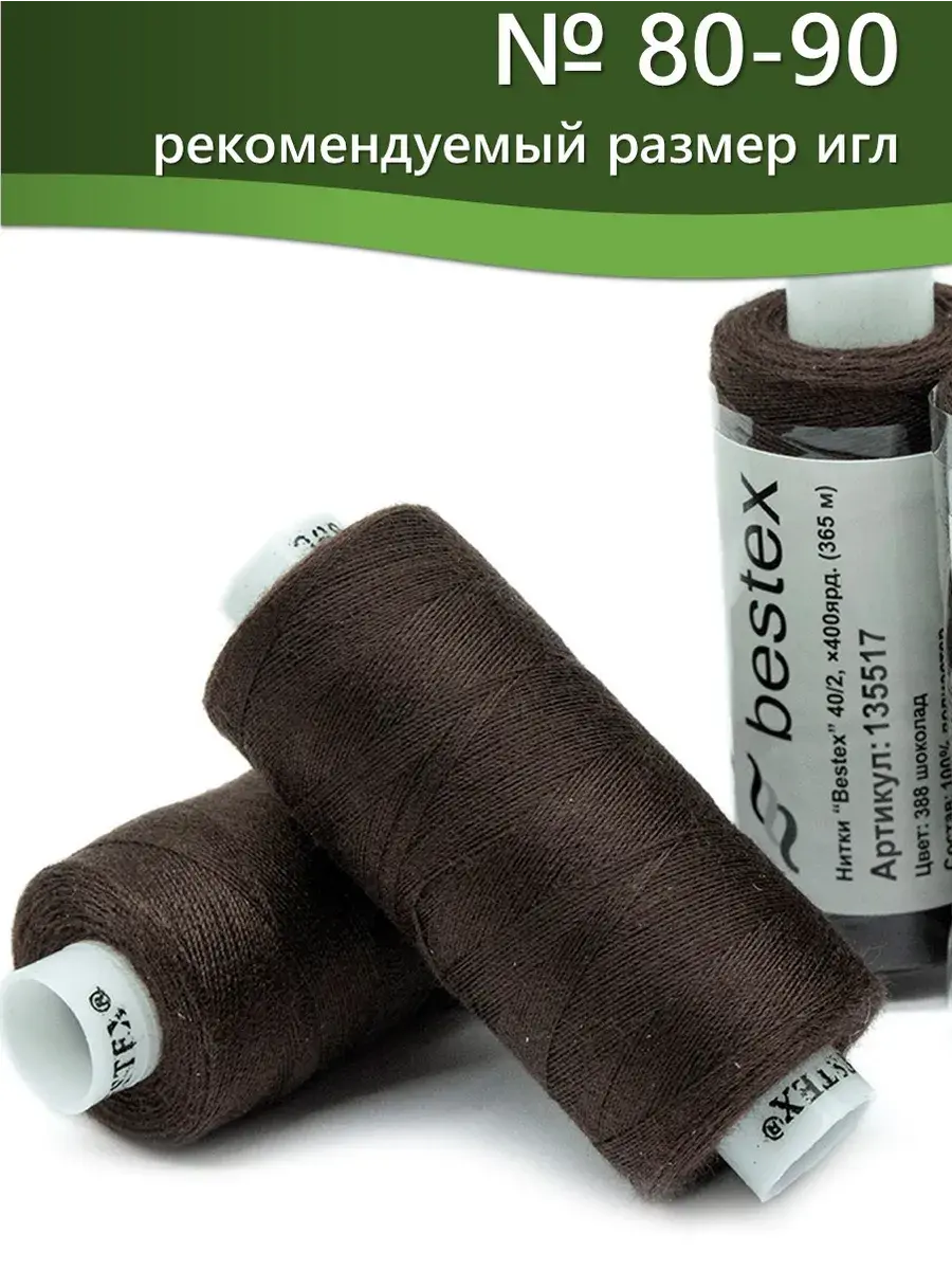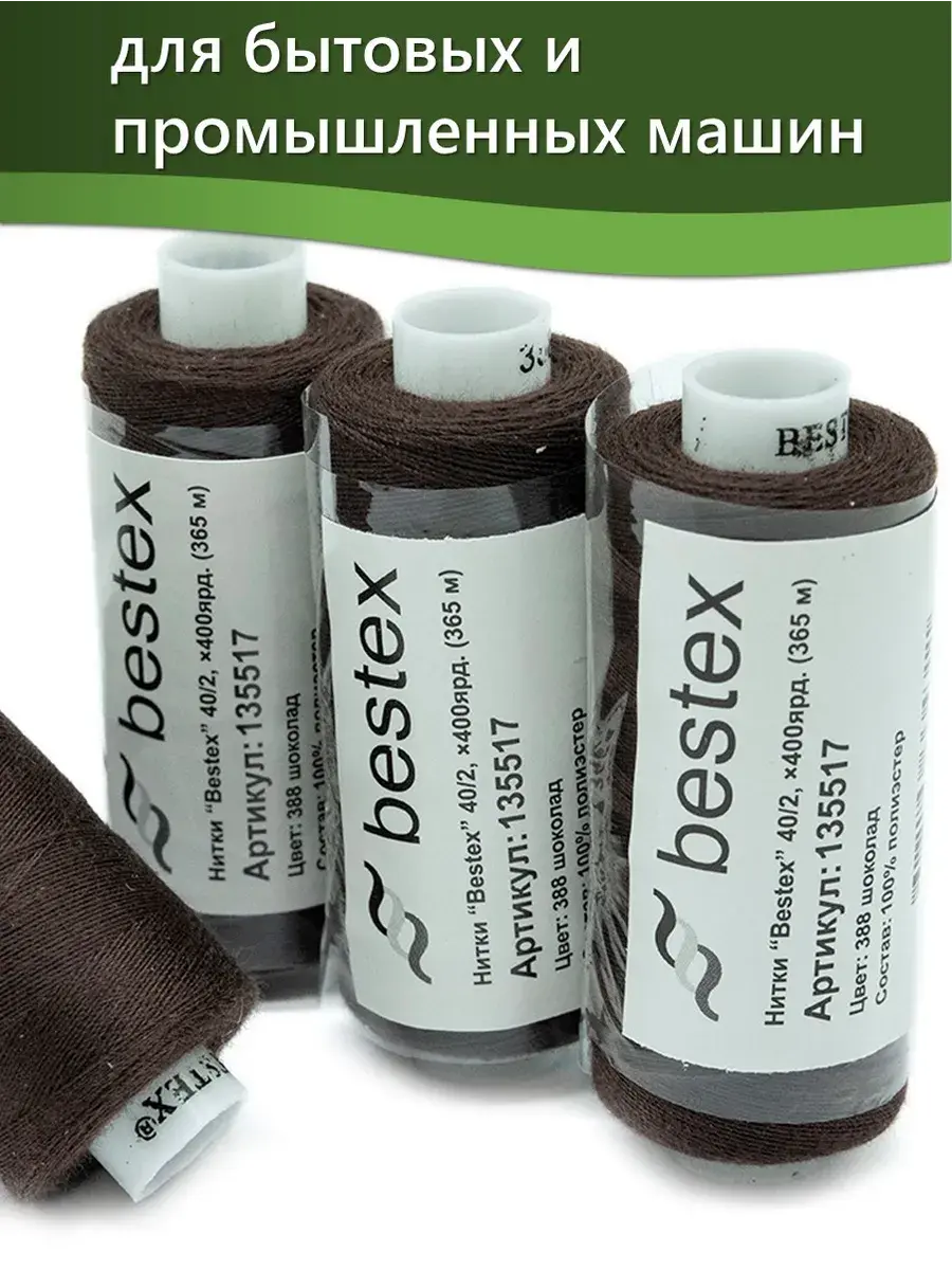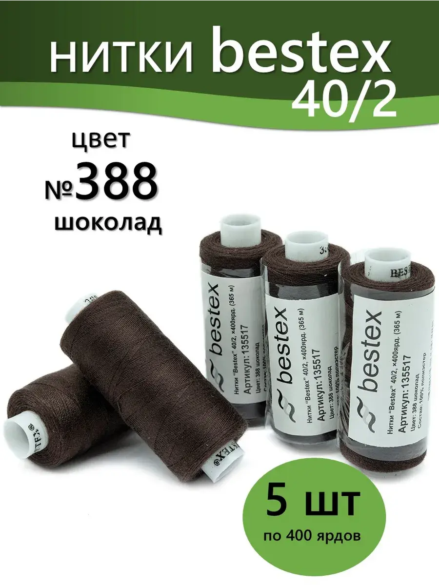 Набор ниток Bestex №40/2 – прекрасный вариант для шитья, ремонта текстильных изделий, рукоделия. Подойдут для бытовых и промышленных швейных машин. Изготовлены из 100 % полиэстера, прочные на разрыв и слегка эластичные, равномерные по толщине, имеют правостороннюю крутку. Обработаны силиконом на 3%, поэтому меньше разрываются при работе на высоких скоростях. Не истончаются и не теряют цвет после многократных стирок и от воздействия ультрафиолетовых лучей. Усадка минимальна, ворс и узелки почти не выражены. Нитки №40/2 подходят для работы с легкими тканями и тканями среднего веса. Назначение: – ремонт текстильных изделий, штопка вещей из трикотажа; – обработка срезов; – шитье вручную и на швейной машине. Линейная плотность: 14,8 x 2 текс. Разрывная нагрузка: 1050 сН. Рекомендуемый размер иглы: №80-90. В упаковке 5 бобин в намотке 400 ярдов.