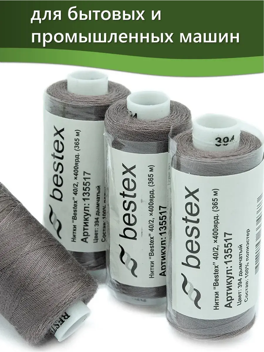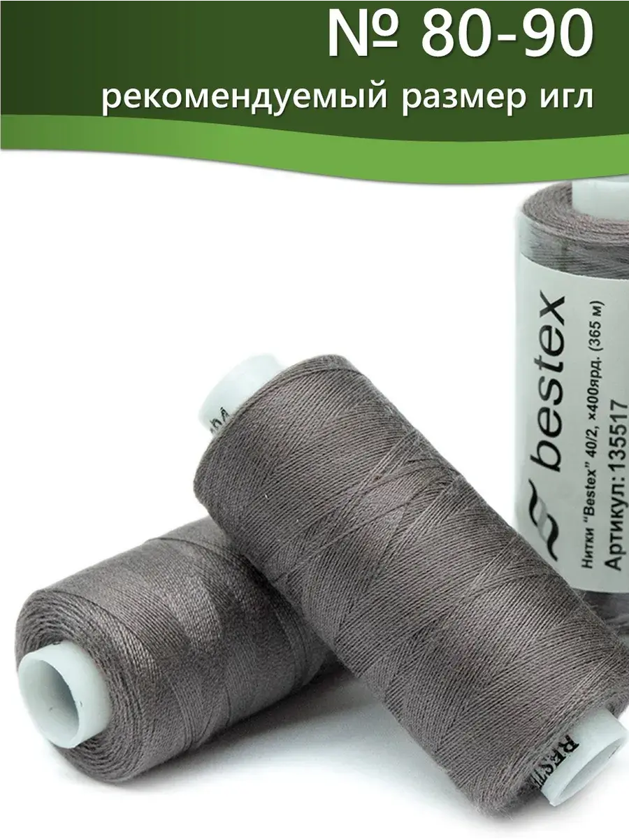Набор ниток Bestex №40/2 – прекрасный вариант для шитья, ремонта текстильных изделий, рукоделия. Подойдут для бытовых и промышленных швейных машин. Изготовлены из 100 % полиэстера, прочные на разрыв и слегка эластичные, равномерные по толщине, имеют правостороннюю крутку. Обработаны силиконом на 3%, поэтому меньше разрываются при работе на высоких скоростях. Не истончаются и не теряют цвет после многократных стирок и от воздействия ультрафиолетовых лучей. Усадка минимальна, ворс и узелки почти не выражены. Нитки №40/2 подходят для работы с легкими тканями и тканями среднего веса. Назначение: – ремонт текстильных изделий, штопка вещей из трикотажа; – обработка срезов; – шитье вручную и на швейной машине. Линейная плотность: 14,8 x 2 текс. Разрывная нагрузка: 1050 сН. Рекомендуемый размер иглы: №80-90. В упаковке 5 бобин в намотке 400 ярдов.